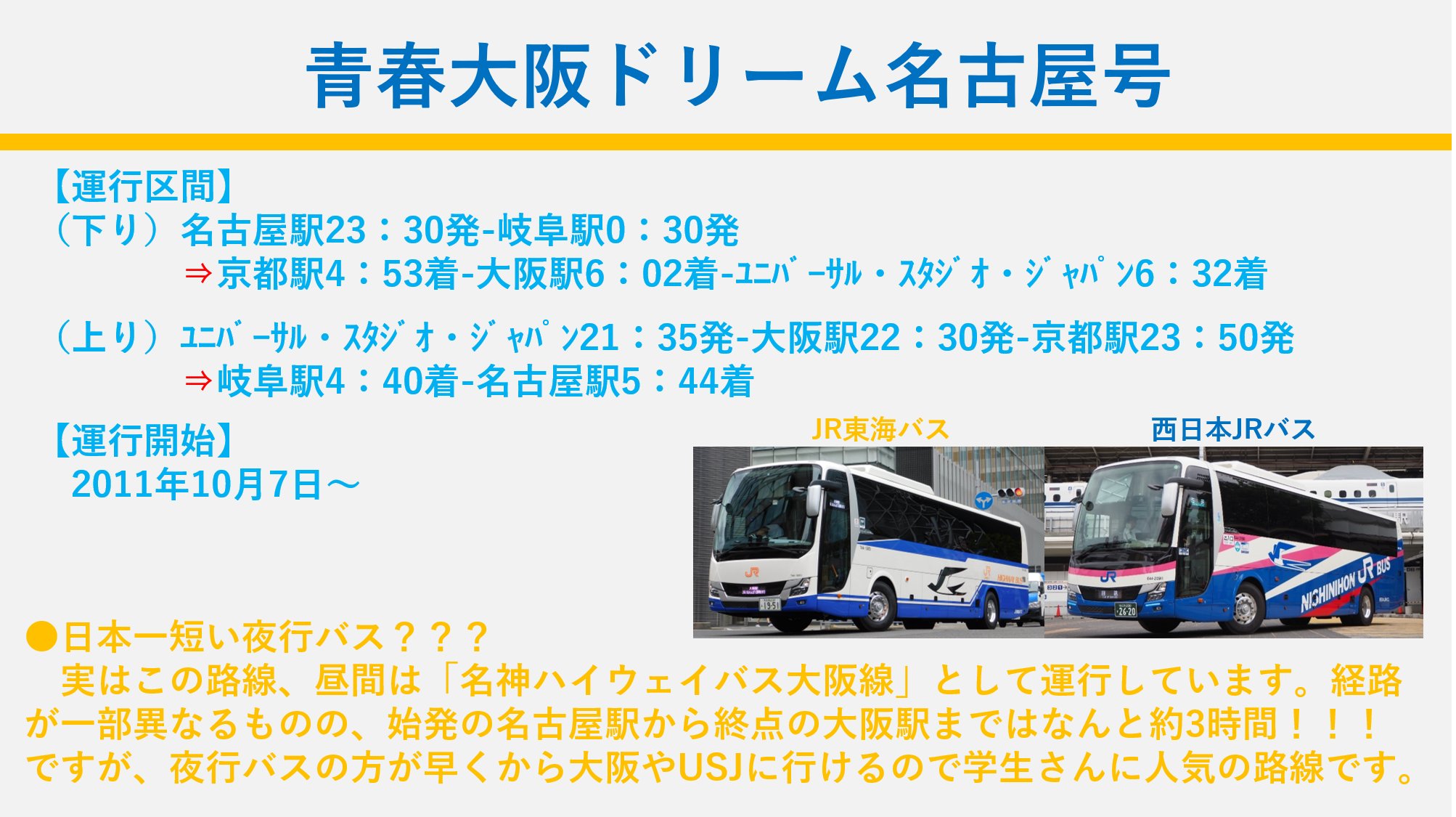 公式 ジェイアール東海バス株式会社 中の人sザキです 本日10月7日 実は当社と西日本jrバスが運行する 青春大阪ドリーム名古屋号 が運行10周年を迎えました 名古屋駅 大阪駅 Usjを結んでいます この路線 日本一短い夜行バス なんて言われ